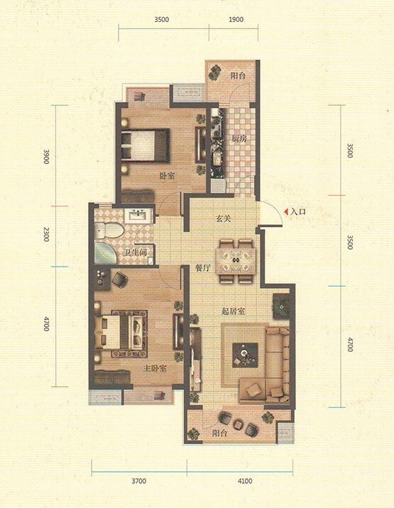 客厅开间为4.5米,和餐厅相连,功能清晰。餐厅和厨房相对,动线合理。卫生间为干湿分离,只是和北向卧室有一定距离。