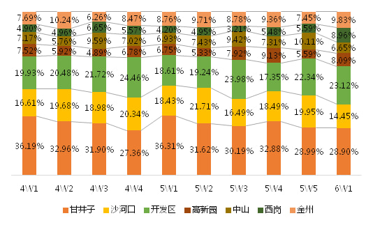 图:近十周各行政区成交占比走势(数据来源:大连链家成交数据)