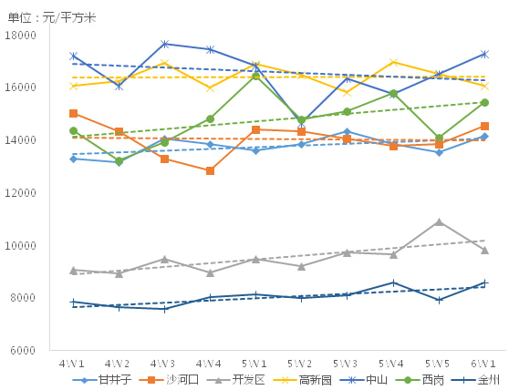 图:近十周各行政区二手房成交均价走势(数据来源:大连链家成交数据)