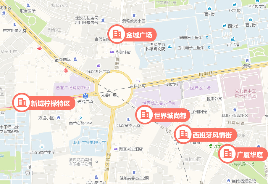 光谷商圈主要由光谷步行街、鲁巷广场、光谷国际广场所、世界城等组成,涵盖购物广场、娱乐中心、社区街铺等,业态非常丰富。此外,周边高校云集,有华中科技大学、武汉地质大学、中南民族大学、中南财经政法大学、武汉纺织大学等,人群主要以大学生、白领等年轻人群为主。