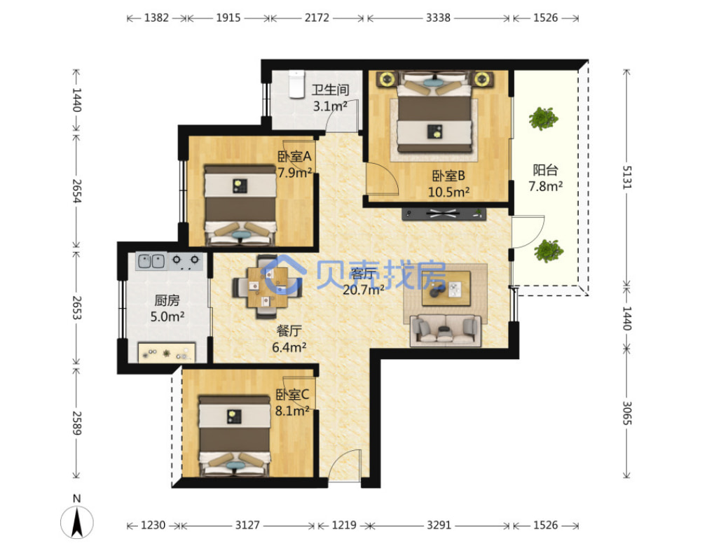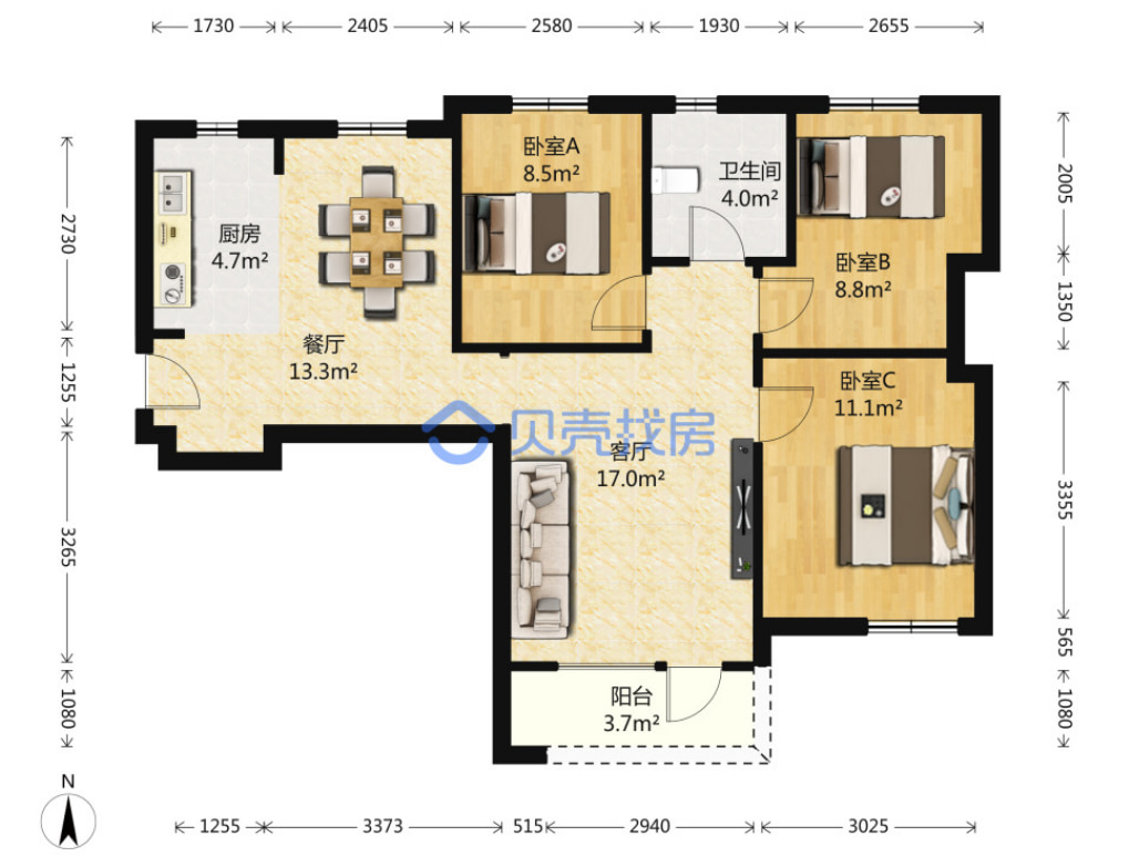 特点:南北通透小三房,户型方正,总价低。
