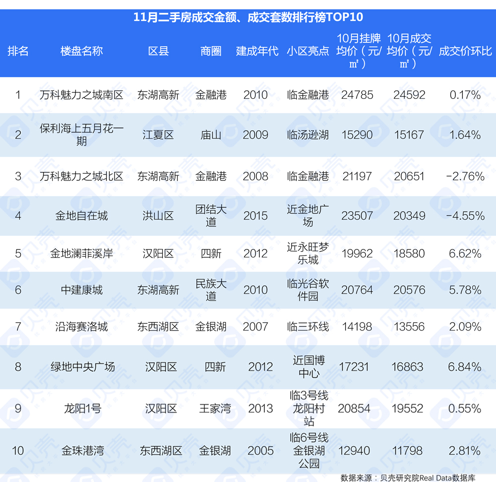 本期栏目,贝壳武汉站内容中心为你整理出11月份二手住宅成交排行榜,看看谁一举实力夺魁?谁成为销量黑马?