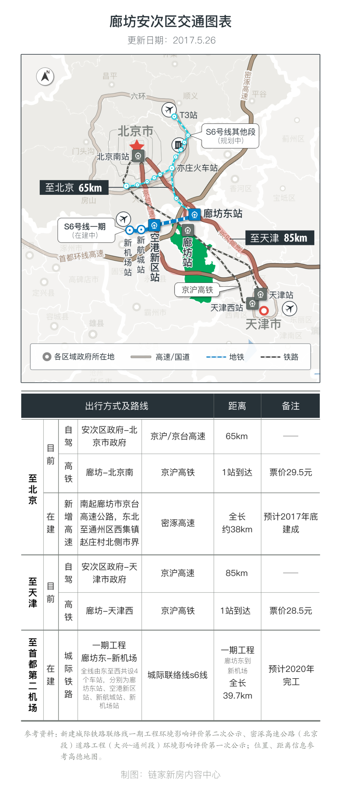 新建城际铁路联络线一期工程线路长度为39.7km。全线由东至西共设4个车站,分别为廊坊东站、空港新区站、新航城站、新机场站。预计2020年完工,建成后可连接廊坊与新机场。