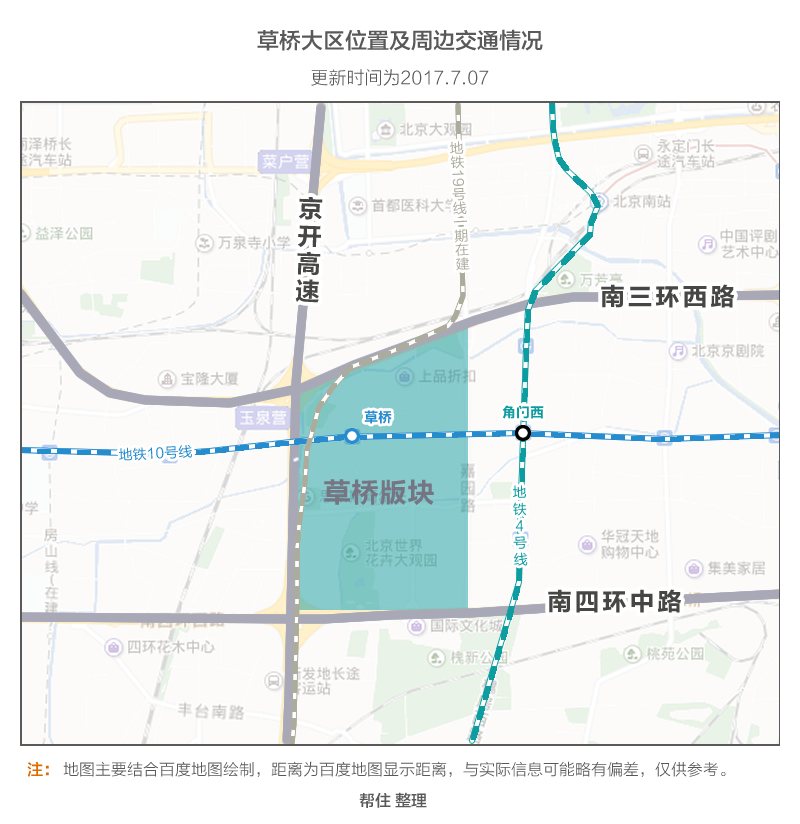 北京草桥位于丰台区的东部,介于南三环到南四环之间,西起京开高速,东至嘉园路。地理位置优越,交通四通八达,地铁十号线东西向横穿草桥,区域内有草桥站,地铁4号线与10号线于角门西站汇合,另外有两条在建地铁线19号一期以及新机场线一期(数据来源百度百科)。交通无疑是购房者考虑的必要因素之一,如果购房置业在草桥交通无须多虑。