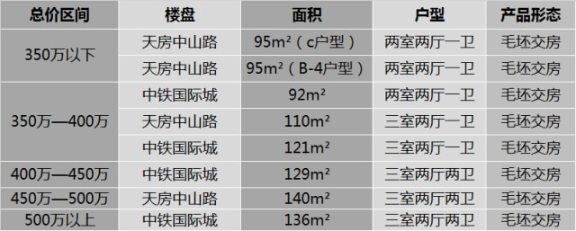 据链家网数据显示,建昌道板块内5月二手房参考均价约为2.5万元/㎡,板块内在售的新房项目比较集中,主要有北宁公元、中铁国际城、紫金府以及天房中山路四个项目,但是北宁公元项目暂时无房,预计2018年才会再开盘。而紫金府暂未定价。以总价为基础对中铁国际城以及天房中山路的户型进行划分,对应户型如下: