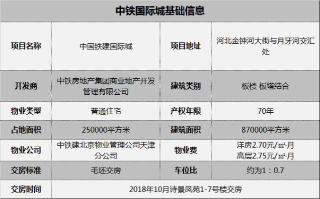 中国铁建国际城位于河北区金钟河大街与中环线交口,属于中环线附近的楼盘,位置在住宅比较集中的生活区,周边交通、生活、商业配套比较齐全。项目临近月牙河,占地面积约25万平方米,由9个地块组成,总建筑面积近百万平方米。产品形式包括住宅、大型商业、步行商街、酒店、公寓等。建筑形式从洋房、小高层到高层产品,满足不同的居住需求。公建配套方面涵盖写字楼、酒店式公寓、商街等多种高端物业。项目分三期开发,目前在售第三期诗景凤苑和诗景雅苑。洋房5、6号楼在售,6层到顶,1梯2户,主推92㎡-136㎡户型。高层1号楼在售,34层到顶,2梯4户,主推90和129㎡户 型。