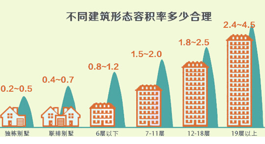一个良好的居住小区,高层住宅容积率应不超过5,多层住宅应不超过3,绿地率应不低于30%。但由于受土地成本的限制,并不是所有项目都能做得到。
