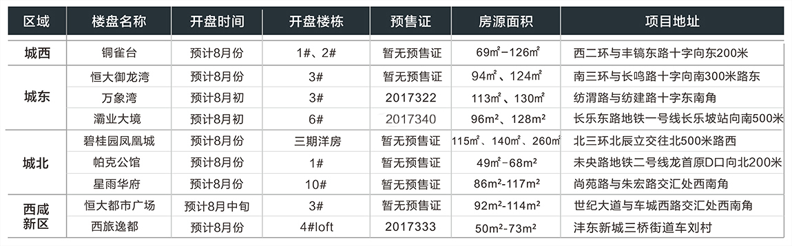 根据数据显示,8月份西安市有19个楼盘预计加推开盘,从物业类型来看,均为普通住宅,其中1盘首开。从区域上来看,其中城东、城北区域有各有3个楼盘新推,城西1个楼盘,城南、西咸、高新均有3个楼盘,曲江最多,有6盘新推。