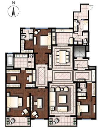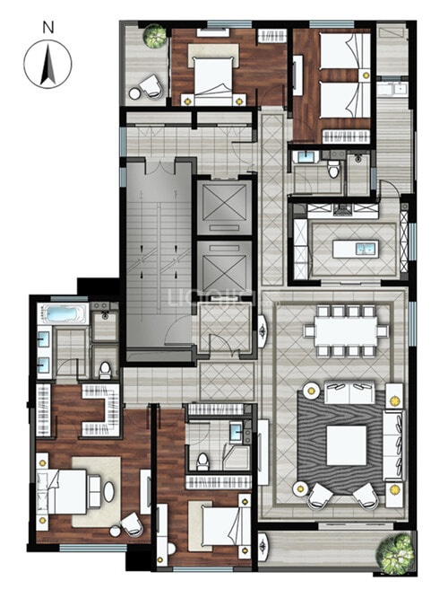 1、303平米,4室2厅4卫,位于6#楼,为2梯2户设计。