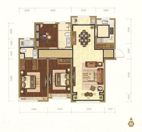 卧室:三室中两个卧室朝南,主卧带私用卫生间及衣帽间,生活舒适。