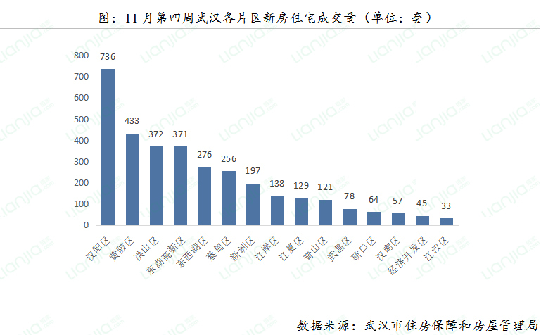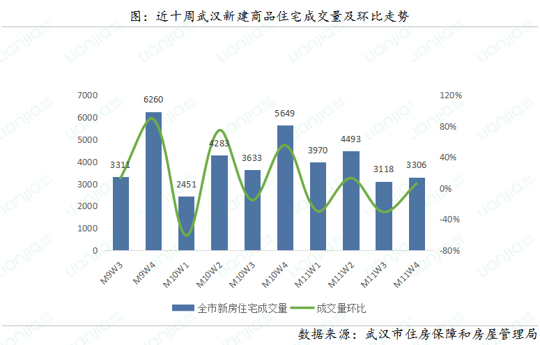 由于新房推盘节奏加快,供应增加,本周成交量小幅上升。11月第四周(11.20-11.26),武汉新建商品住宅成交3306套,环比上升6%;成交面积35万平方米,环比上升8%。