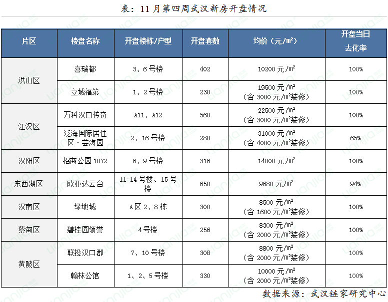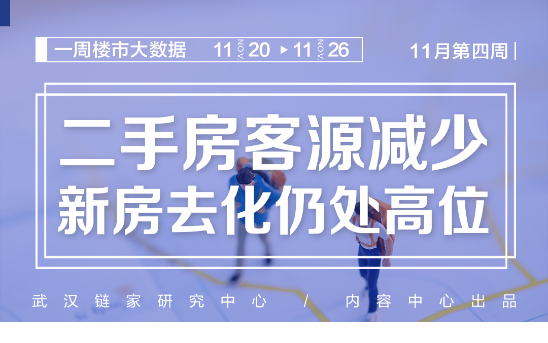 市场量价:11月第四周(11.20-11.26),武汉链家二手住宅成交量环比上升2.99%,二手住宅成交均价为16298元/㎡,环比下降1.48%;武汉新建商品住宅成交3306套,环比上升6%。