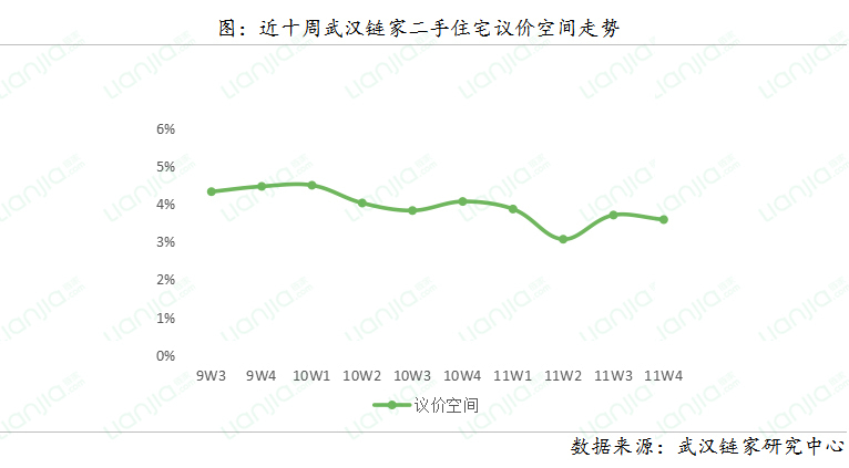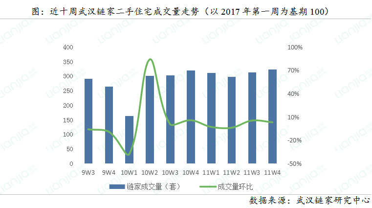 11月第四周(11.20—11.26),武汉链家二手房成交量环比上周上升2.99%,成交量持续稳定。今年10月起武汉市二手房市场热度有所减弱,但“零门槛”落户带来的一波人口红利对楼市成交起到一定的促进作用,高校聚集的洪山区及东湖高新区表现尤为明显。