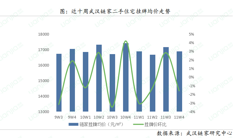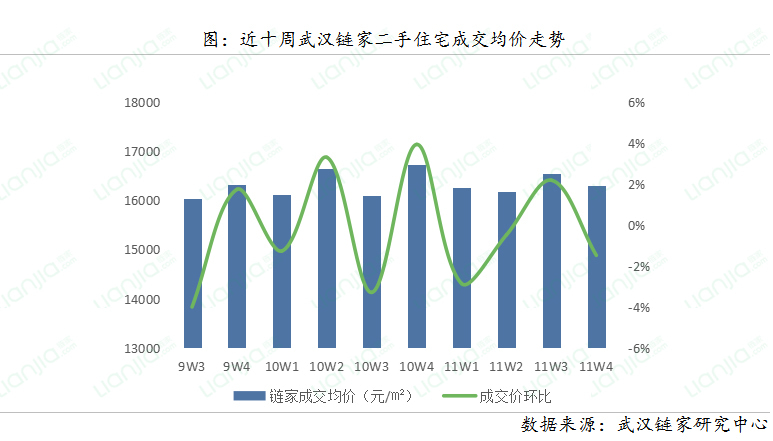 11月第四周武汉链家二手住宅成交均价为16298元/㎡,环比下跌1.48%。主要是受成交结构变化影响,汉阳钟家村及王家湾板块成交量环比上周分别增长77%、95%,拉低整体成交均价。