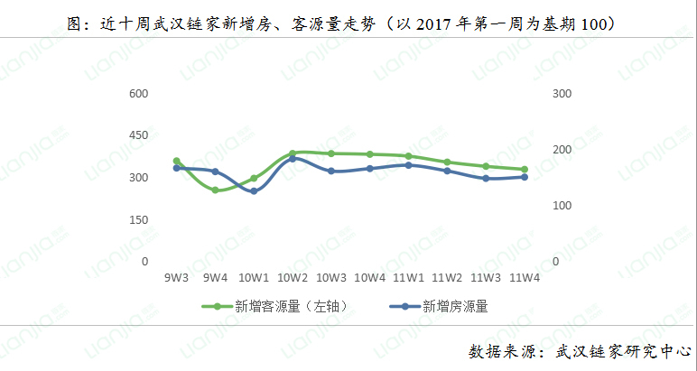 11月第四周,新增房源增多,需求端持续萎缩。新增房源量环比增加1.35%,其中唐家墩板块及王家湾板块新增房源量增长较快,CBD板块及武昌中心板块新增房源量下降;新增客源量环比下降3.20%;带看量环比下降2.96%,带看量连续三周下降。