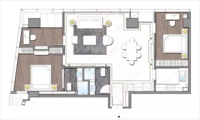 150㎡三室两厅两卫,开间14米,进深约6.85米,客厅和过道均铺装了大理石地面,全屋智能家居系统、厨卫品牌均与70㎡户型为同一系列。