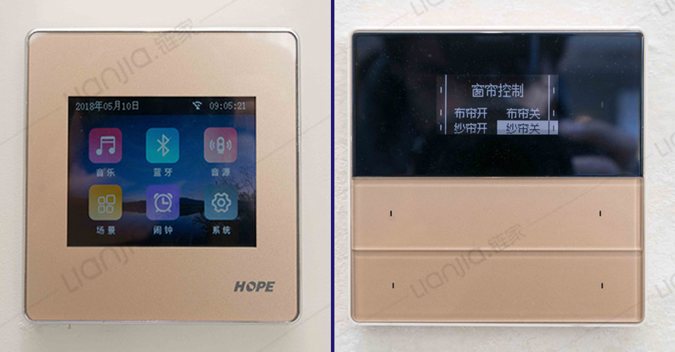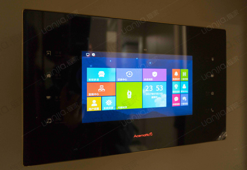 精装配置一体化智能家居系统——意大利ACEMATIC科曼利智能终端,插座面板品牌为西门子。面板可以一键控制室内照明灯光和窗帘,也可以下载APP在手机上进行操作,居家出门更加方便。