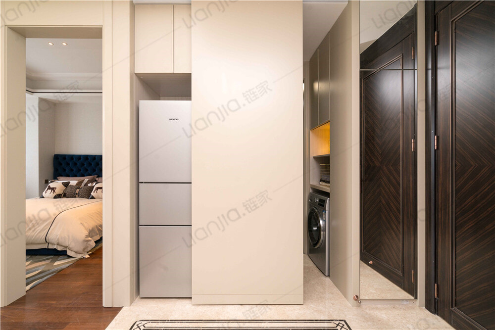餐厅对面是冰箱的预留位置,冰箱镶嵌在墙体之中,采用了移动暗门的设计,西门子冰箱包含在交付中。