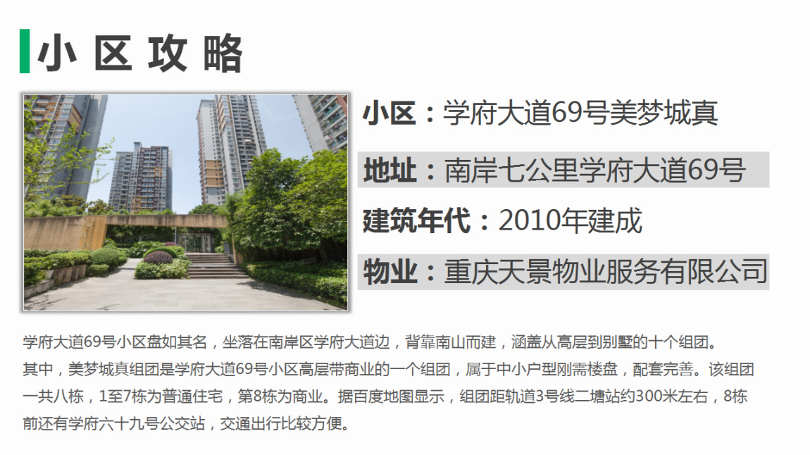南岸学府大道位于南山与滨江路之间,是南岸通往巴南的一段重要道路,从四公里一直延伸到七公里,轨道3号线沿学府大道而建并设有4个站,沿线主要以大学和住宅小区为主,无论是各类配套还是居住环境都比较成熟,深受购房者喜爱。