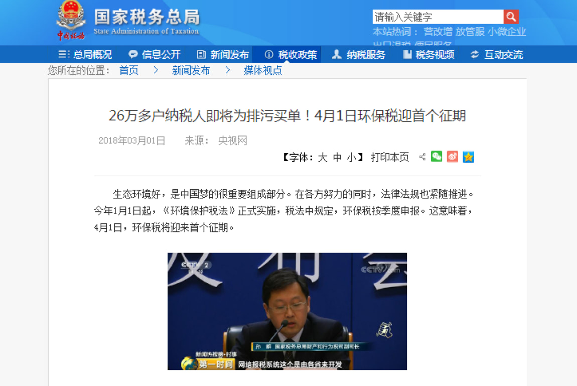 国家税务总局于3月27日对外发布,2018年我国最新亮相的环境保护税将于4月1日迎来首个征税期,目前全国各地税务机关共识别认定环境保护纳税人26万多户。