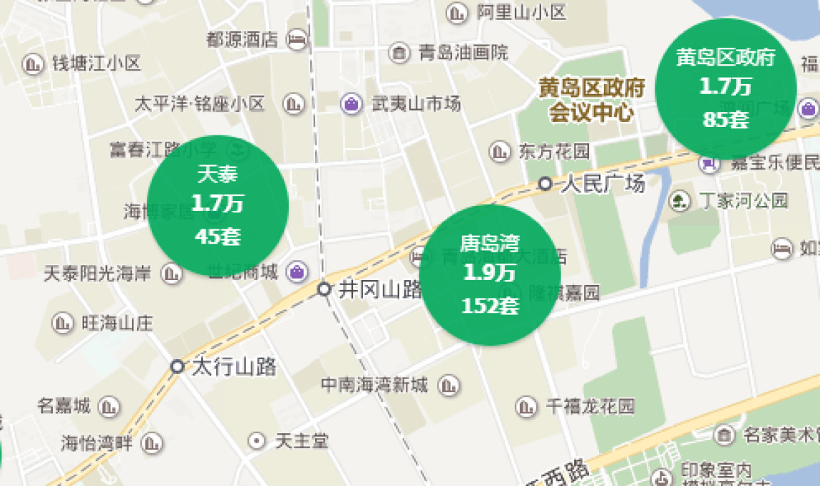 这两个站点位于西海岸新区开发建设较早的经济技术开发区,周边配套设施完善,多为成熟住宅区。小区多建成于2000年前后,目前均价在1.6万/平左右。另外,位于嘉陵江路站西侧的五台山路地块于3月28日被海信以15421.17元/平的价格拍下。