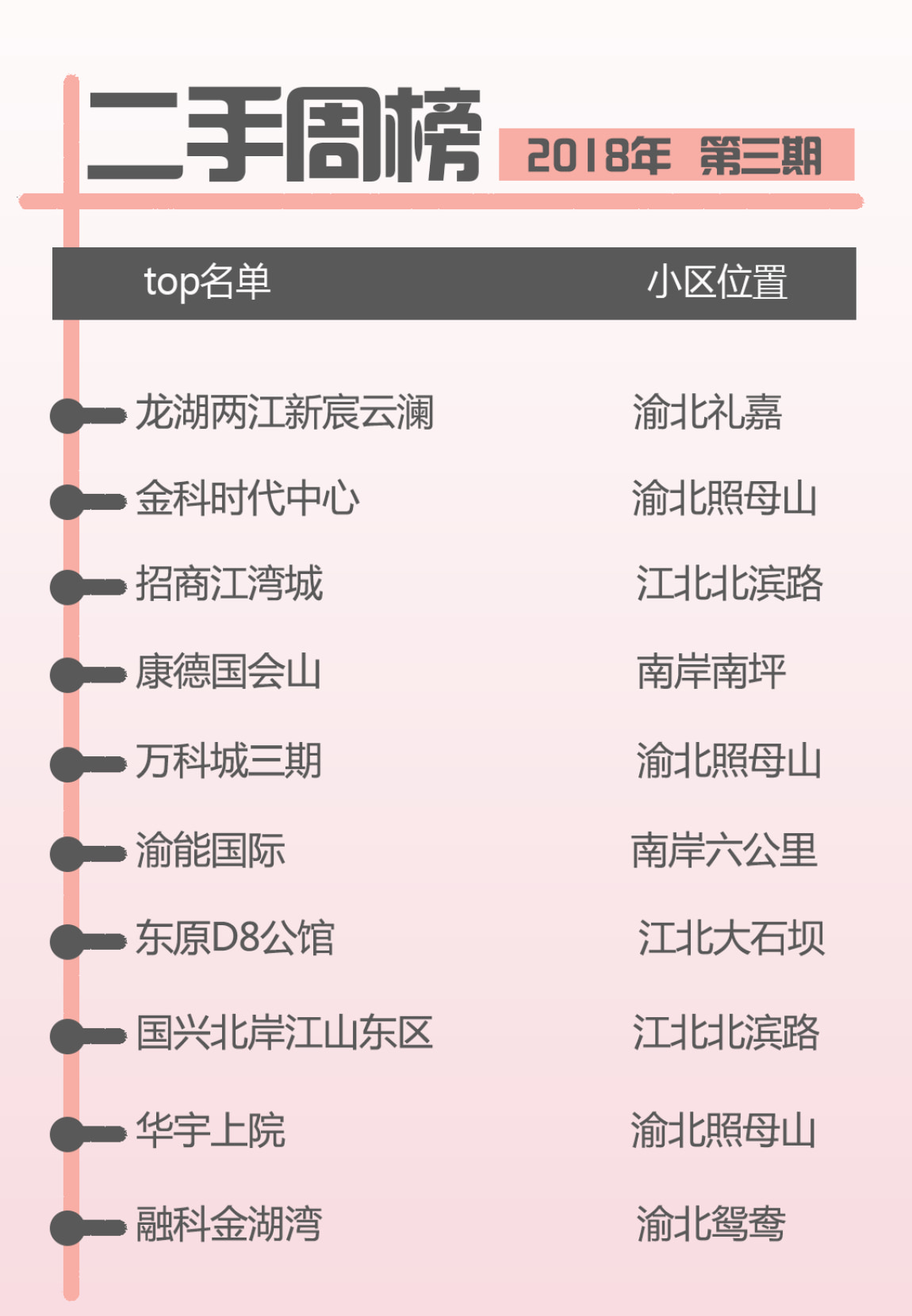 根据重庆链家房源系统4月第一周(4.2-4.8)的成交数据显示,上周渝北的小区热度持续提升,榜单中一半的小区都在渝北,仅照母山一个商圈就有3个热门小区。此外,北滨路也有2个小区上榜。在本期的十大热门小区榜单中,华宇上院则是连续两周登榜。