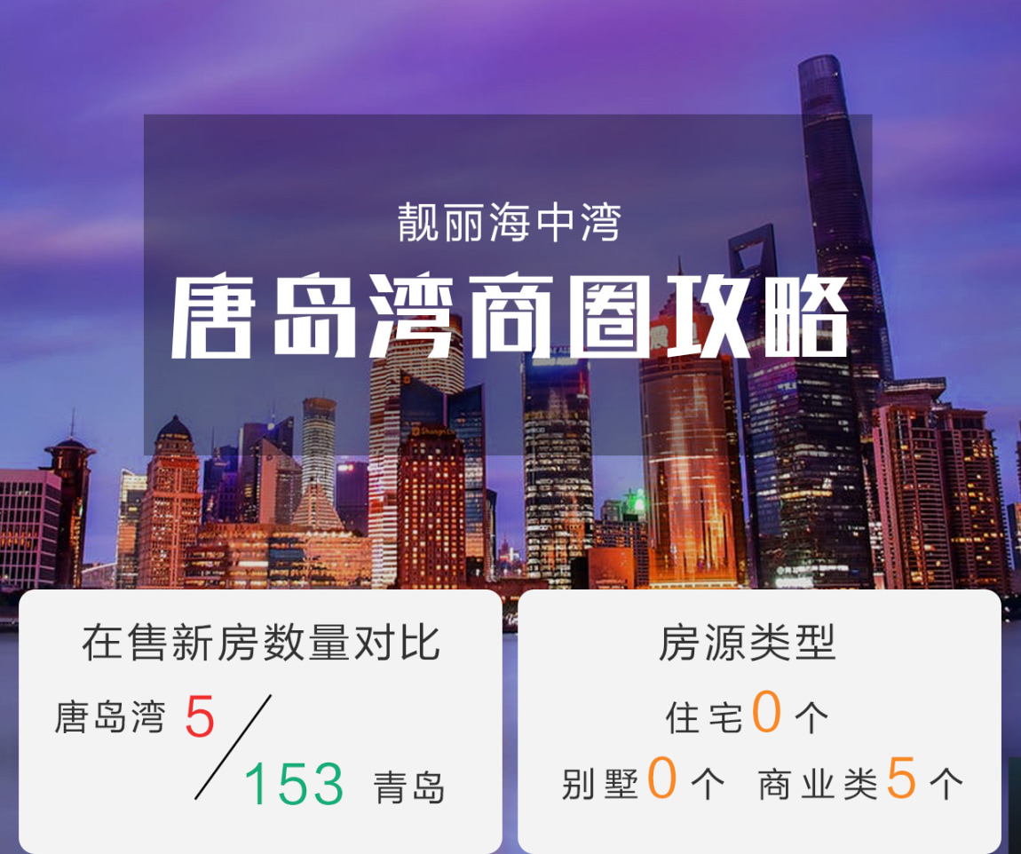 截至2018年4月20日,唐岛湾商圈内共计有5个新盘在售,青岛城市传媒广场、恒大金沙滩、索菲亚国际中心、荣德海岸壹号、瑞源名嘉国际均为商业类项目(其中荣德海岸壹号、索菲亚国际中心现已售罄,后期加推信息可持续关注链家网新房),暂无住宅在售。