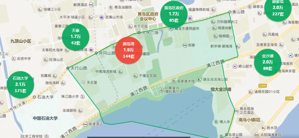 据链家网二手房数据显示,截至2018年4月20日,唐岛湾商圈在售房源144套,在售均价为1.9万元。多数房源房龄较新,刚需、改善类房源均有,购房者可选择范围较广。