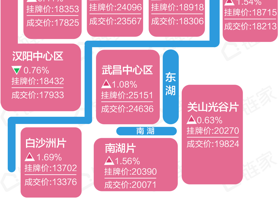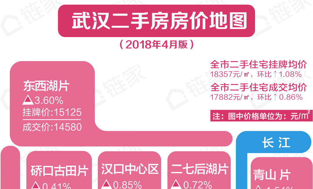 根据武汉链家研究中心数据显示,4月份二手住宅房价地图如下: