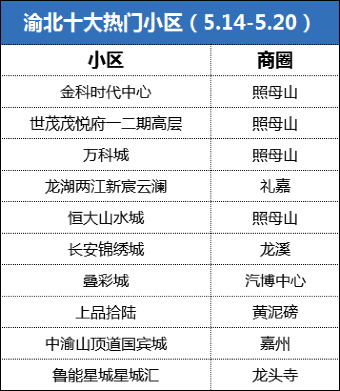 根据重庆链家房源系统5月第三周(5.14-5.20)的成交数据数据,整理了一份渝北热门小区榜单。
