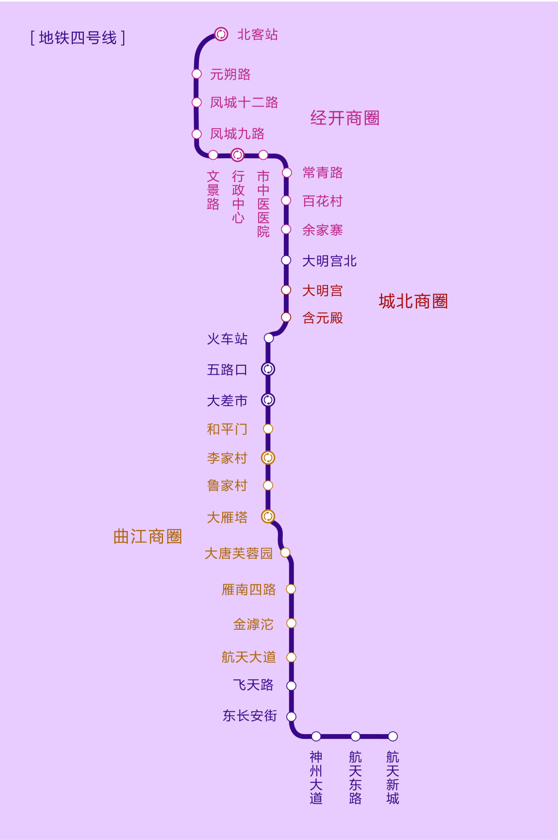 地铁4号线北起北客站,南至航天新城,全程35.2公里,设置站点29座,贯穿了经开、城北、曲江、城内等四大商圈,地铁4号线是西安继2号线之后,又一条贯穿南北的地铁线,此线开通后,沿线居民出行质量将有更大的飞跃。