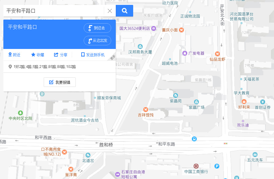 紫晶苑位于和平路与平安北大街交口,小区位置出行比较便利,小区南门临近石家庄快速路和平路,小区南门还有1环2路、4路、5路、21路、85路、88路、102路多趟公交站点,不管你是自驾还是公交出行都非常便利。