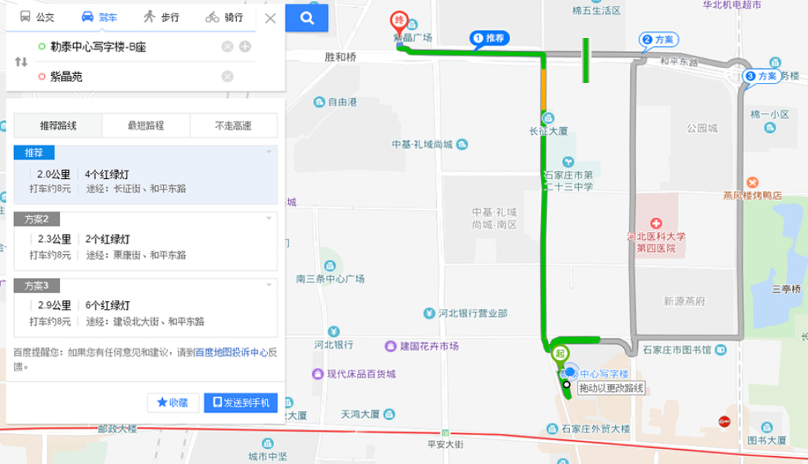今天去紫晶苑小区的出行方式我们选择自驾,体验一下在主干道上的路况如何,我们从勒泰出发沿正东路——栗康街——平安北大街——到达目的地紫晶苑,这一路上非常通畅。