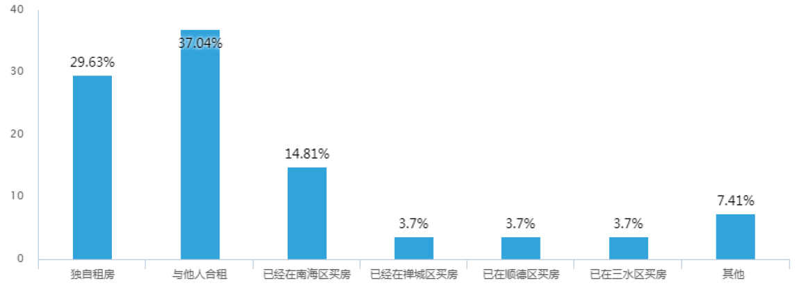 根据《在路上,见证城市生活变迁》的问卷调查结果得知,将近六成人在佛山选择租房子,其中与他人合租占37.04%,独自租房占29.63%。在买房方面,南海区成为最受购房者欢迎的地区,禅城、顺德、三水持平。