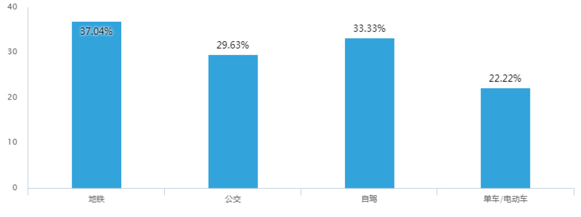 在这部分人中,从家到单位首选的交通工具依次是地铁、自驾车、公交车和单车或电动车,所占比例分别是:37.04%、33.33%、29.63%、22.22%。