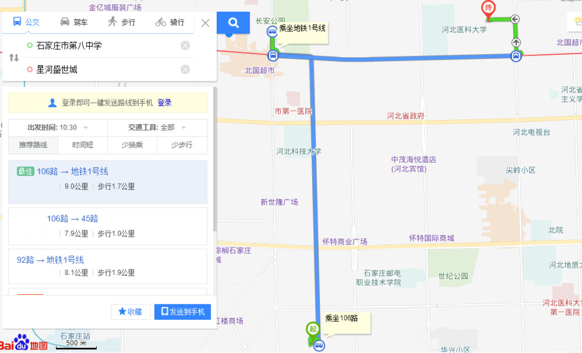 今天我跟大家介绍的是星河盛世城,首先从自家出发,选择的交通工具是公交+地铁,公交车乘坐106路,八中站上车——北国商城站下车,步行大约50米,进入北国商城地铁站,乘坐1号线——北宋站下车。北行大概500米,到达目的地——星河盛世。