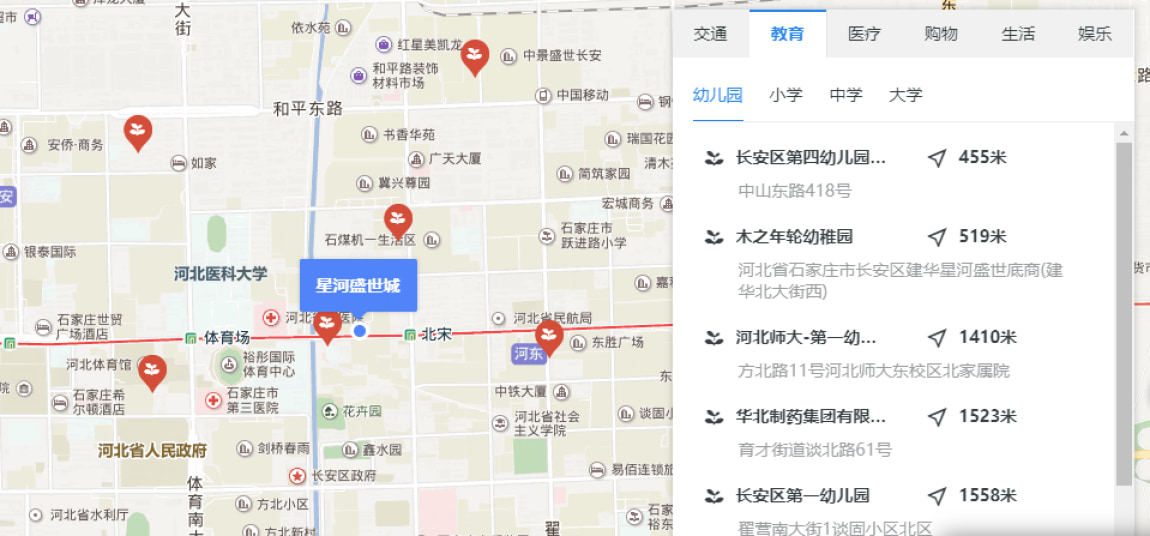星河盛世位于建华北大街与跃进路西南角,从小区位置看,自驾和地铁比较便利,距离星河盛世南门口大约300米左右的距离有地铁一号线的北宋站。小区门口没有公交,在建华北大街与跃进路交口的位置有12路、21路、45路、57路、73路、观光1路等多趟公交站点,所以公交出行还算便利。