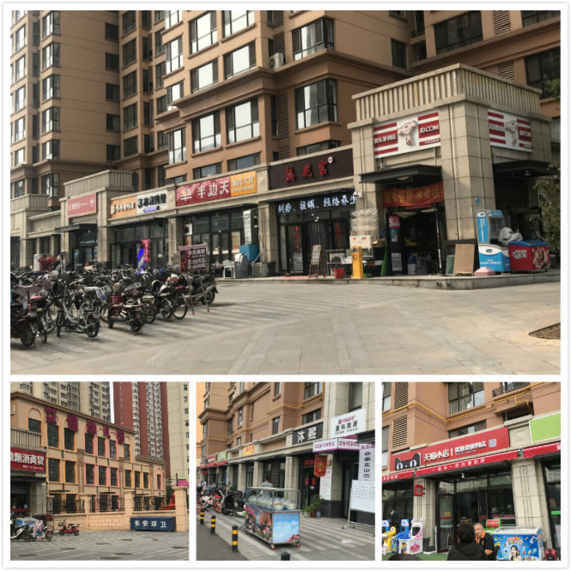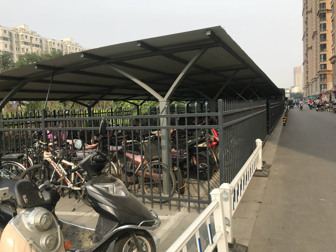 来到了小区的北入口,在北门口底商对面是一列停车棚,里边停满了非机动车。