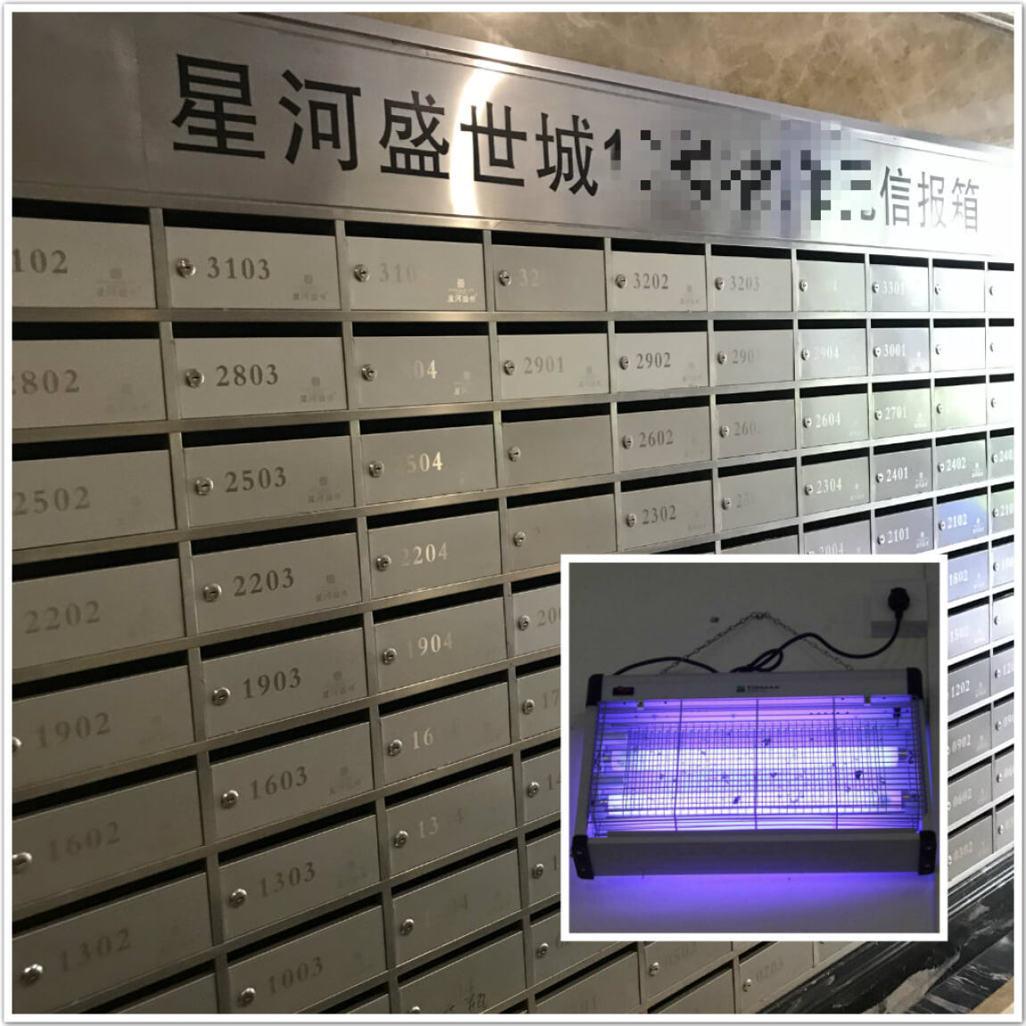 进入一栋楼内,除了意料之中的干净整洁之外,我还发现了悬挂在单元门内侧的驱蚊灯。因为小区内绿化率较高,夏季也应是蚊虫多发的季节,但是在楼道里安装的驱蚊灯,可以有效地祛除蚊虫,上文有提到细节处见真章,这也便是体现物业精致管理的细节之一。