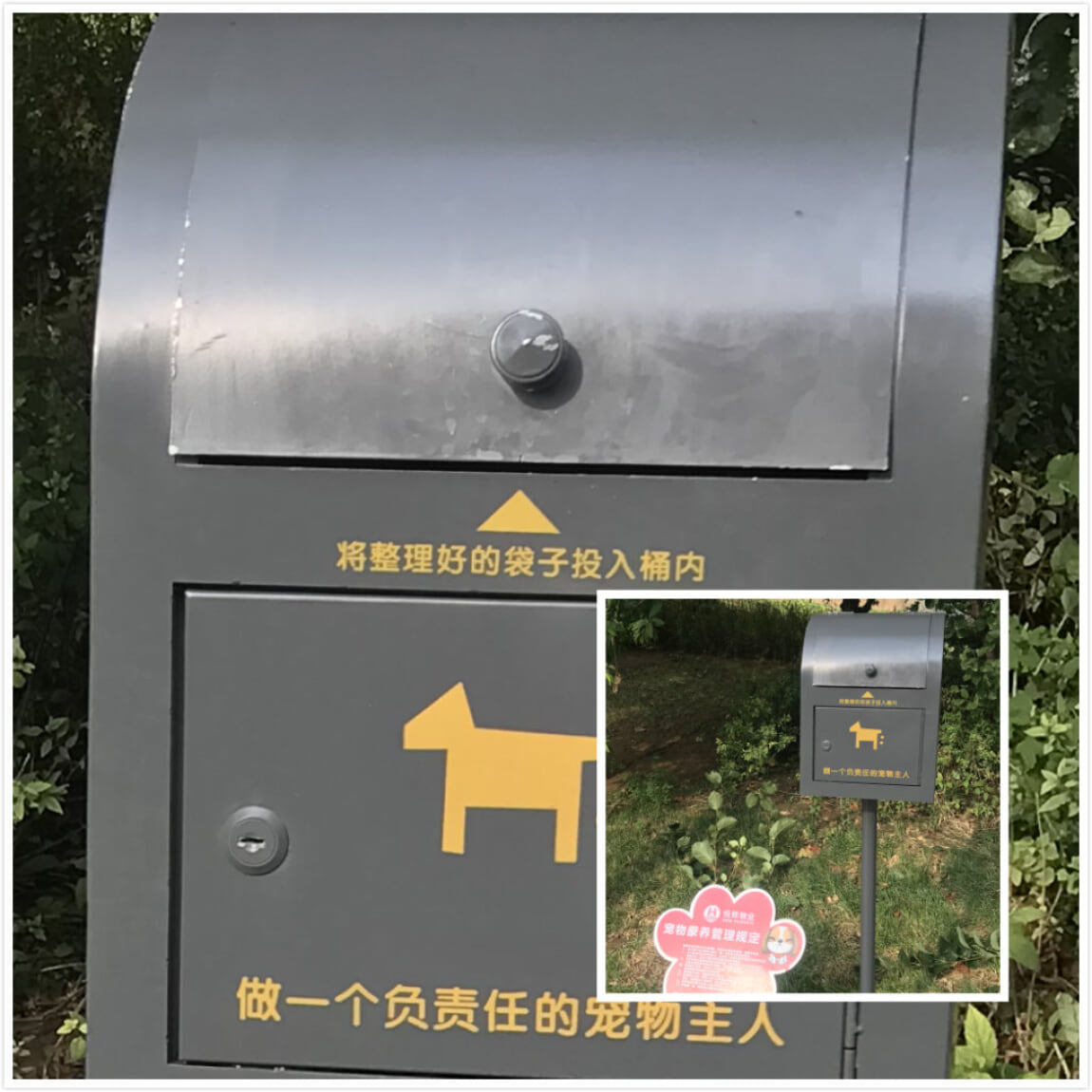 旁边的小物件吸引了我的目光,小区内不乏喜爱宠物,好养宠物之人,爱好养狗人士都知道,狗狗需要每日带出来遛弯,除了愉悦它们的心情之外,还有很重要的一件事,就是解决狗狗的大小便问题。小区内的这个宠物便便垃圾箱,除了为业主提供方便之外,还很好的解决了垃圾分类的问题,这也是我要说的一个小细节。