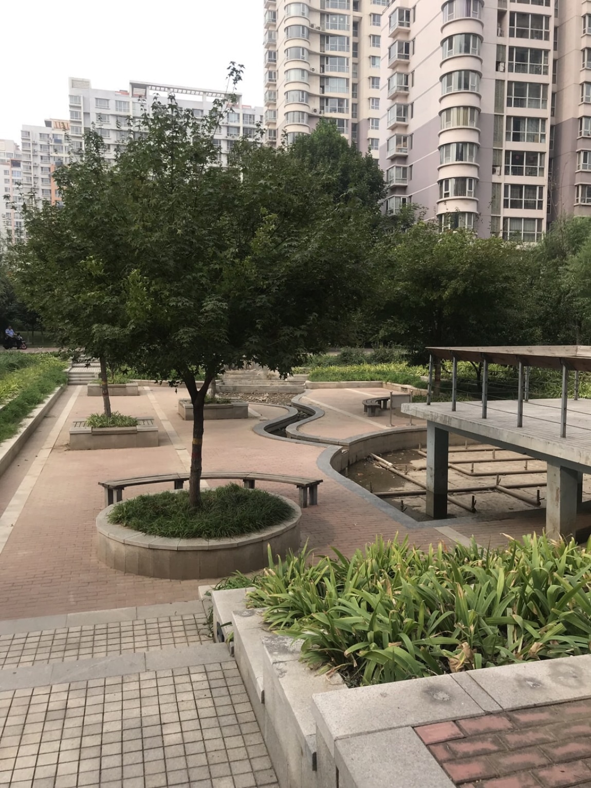 正式进入小区后,映入眼帘的便是高大的树木,和低矮的草丛,小区的园林设计还算具有设计感一些,小区内绿植葱郁茂盛。