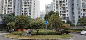 小区一进大门处就有一个圆形的小花园,花园里的草坪上堆放了一座小假山,周围种了一圈不同种类的树,有竹子、枫树、桂花等,所以一进小区,就能够闻到清新宜人的桂花香味。