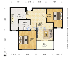 特点:两个卧室朝南且带落地窗,风景开阔;各个空间户型方正,方便室内家具布置;客厅与餐厅不分离,可以提高空间的利用率,使房屋看起来更温馨。
