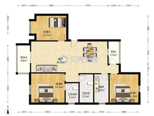 特点:此户型各个空间方正,方便室内家具布置;南北通透,采光充足;生活空间合理,各个功能区的尺寸比例规范, 卫生间和厨房等主要功能间的尺寸以及比例适中。