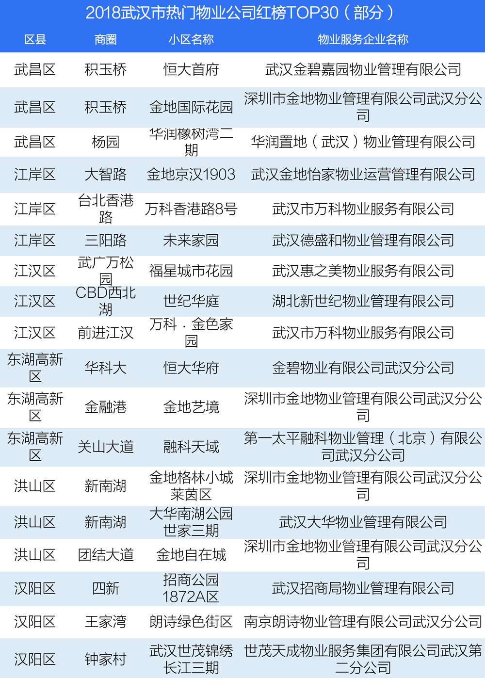 2019年1月21日,武汉市房管局发布2018年住宅小区物业服务质量考评“红黑榜”(后附完整排行榜单)。快来看看,你家小区上榜没?哪个小区物业夺得榜首?本期专题,为你精选武汉优质物业小区,让您住得更安心!