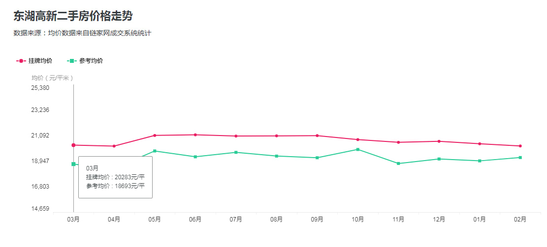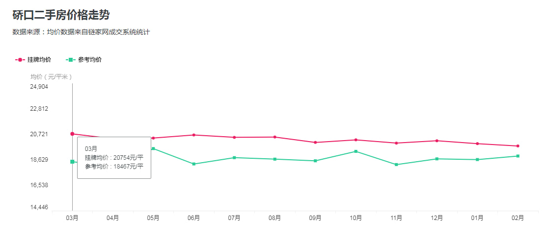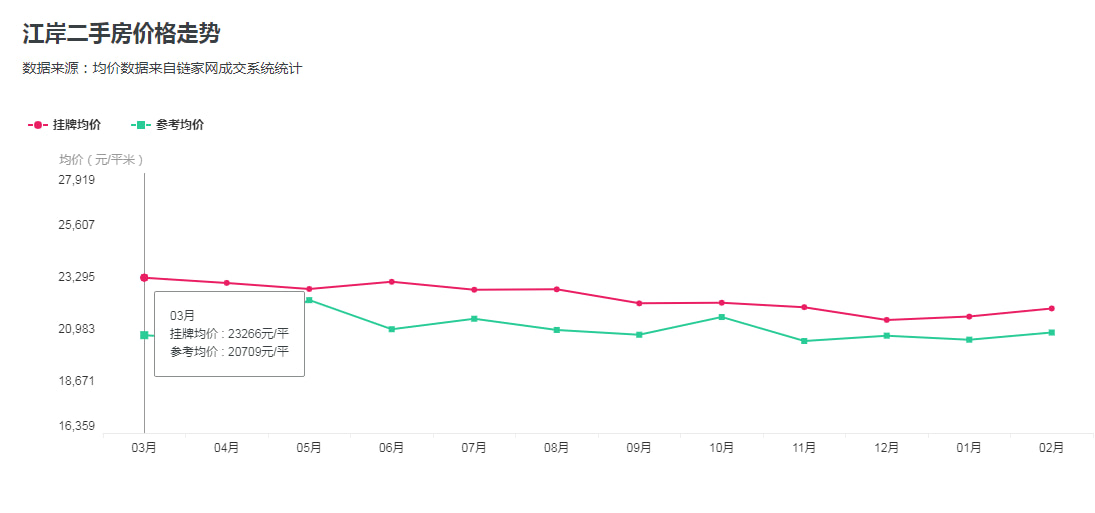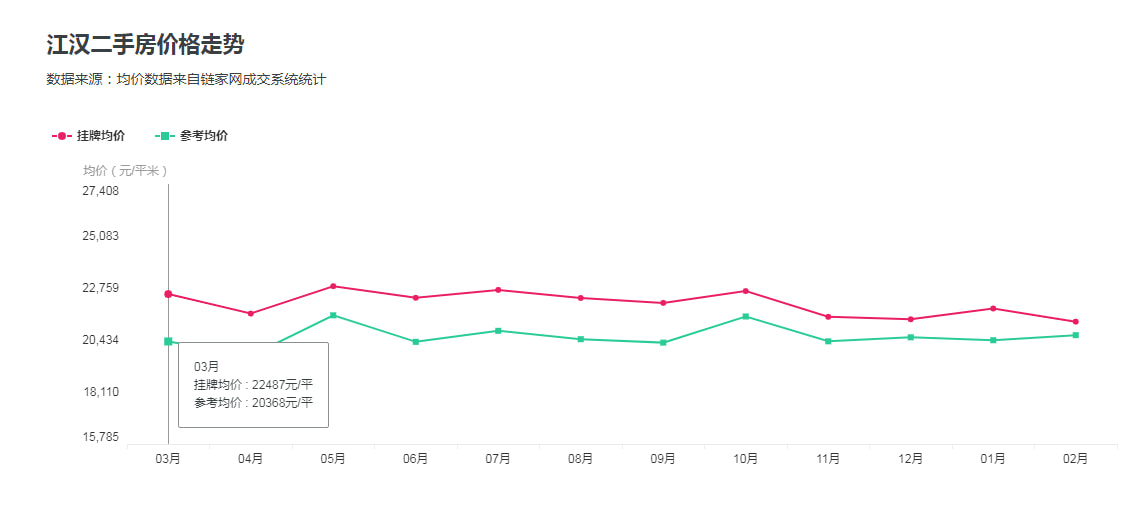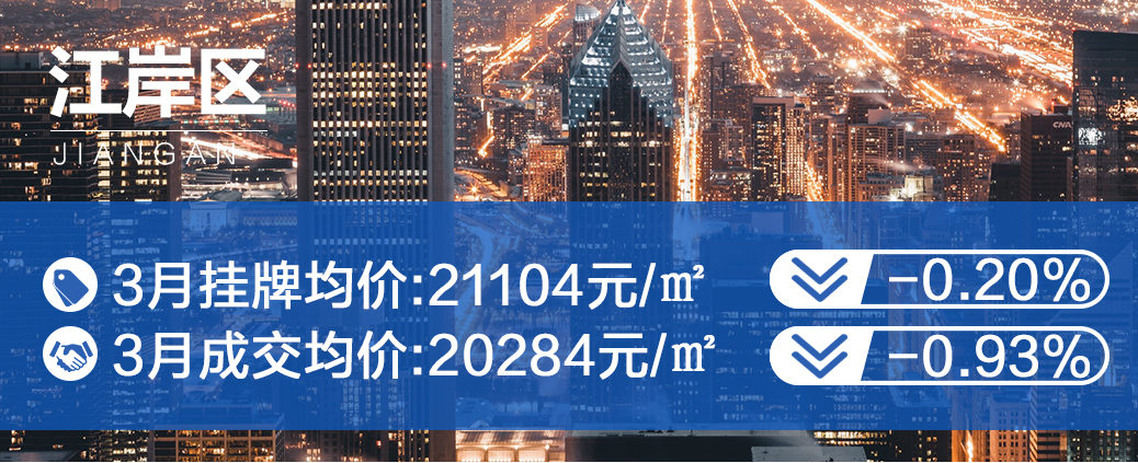 (2019年3月江岸区成交均价为20284元/㎡,与2018年3月相差不大,均价同比下跌425元/㎡)