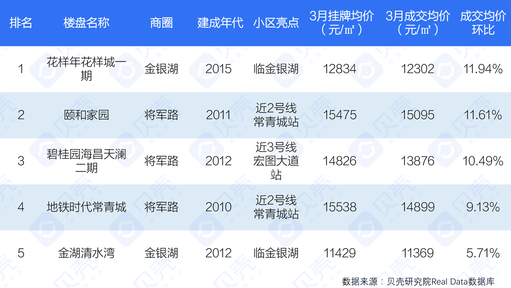 3月热门商圈TOP3分别是金银湖、将军路、常青花园。3月商圈成交均价分别为12689元/㎡、14236元/㎡、17256元/㎡。金银湖商圈刚需购房者扎堆,二手成交均价低于片区当月均价,具有地铁线路发达、生态环境好等特点。