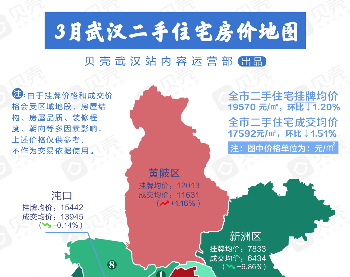阳光明媚的3月,武汉楼市也迎来了“小阳春”,“金三银四”房价跌还是涨?本期栏目,贝壳武汉站内容部选取72774个二手住宅真实样本,为你盘点3月份武汉14个区县二手房价,附90个热门小区真实挂牌均价和成交均价。