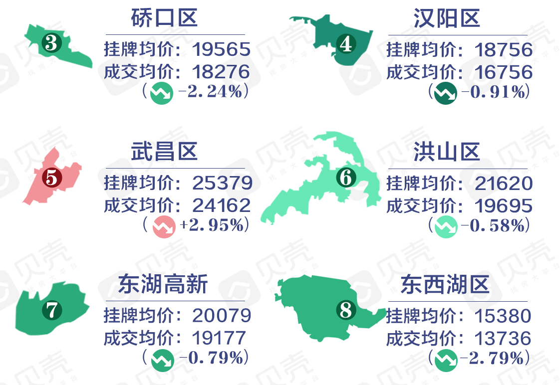 3月份,全市二手住宅挂牌均价19570元/㎡,环比下跌1.20%;全市二手住宅成交均价为17592元/㎡,环比下跌1.51%,继1月以来连跌3个月。 其中,除武昌区、黄陂区、青山区的成交均价呈现上涨趋势外,其余区县均为下跌趋势。主城区中东西湖区跌幅较大,环比下跌2.79%,3月片区成交均价为13736元/㎡。武昌区涨幅较大,环比上涨2.95%,3月片区成交均价为24162元/㎡。
