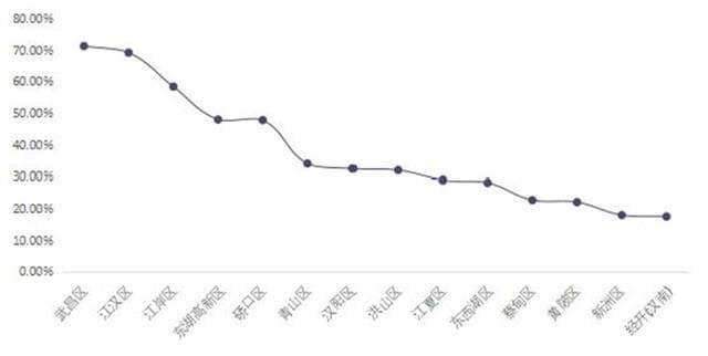 据了解,2018年,武昌区二手住宅的交易占比达到了区域住宅交易总量的71.28%;江岸区、江汉区的交易比重同样超过了50%,硚口区也基本呈现为新房、二手房各占半壁江山的情况,东湖高新区二手房交易比重达到了47.93%。